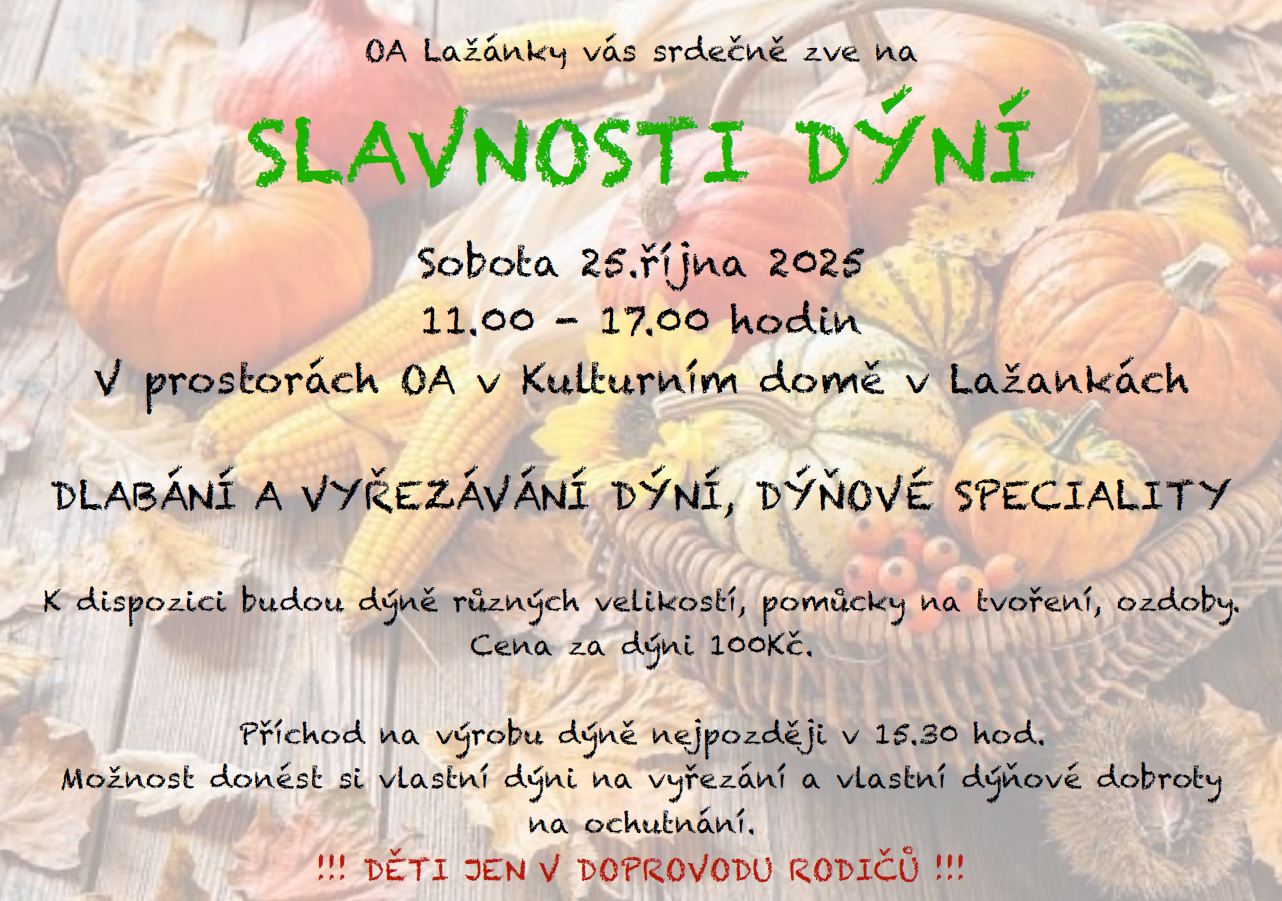 OA Lažánky vás srdečně zve na Slavnosti dýní v sobotu 25.10.2025 11-17hod. v prostorách OA v kulturním domě v Lažánkách. Budeme dlabat a vyřezávat dýně.